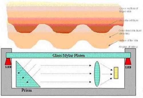 主要是利用光的折摄和反射原理,将手指放在光学镜片上,手指在内置光源照射下,光从底部射向三棱镜,并经棱镜射出,射出的光线在手指表面指纹凹凸不平的线纹上折射的角度及反射回去的光线明暗就会不样。用棱镜将其投射在电荷耦合器件上CMOS或者CCD上,进而形成脊线(指纹图像中具有定宽度和走向的纹线)呈黑色、谷线(纹线之间的凹陷部分)呈白色的数字化的、可被指纹设备算法处理的多灰度指纹图像。然后对比资料库看是否致。